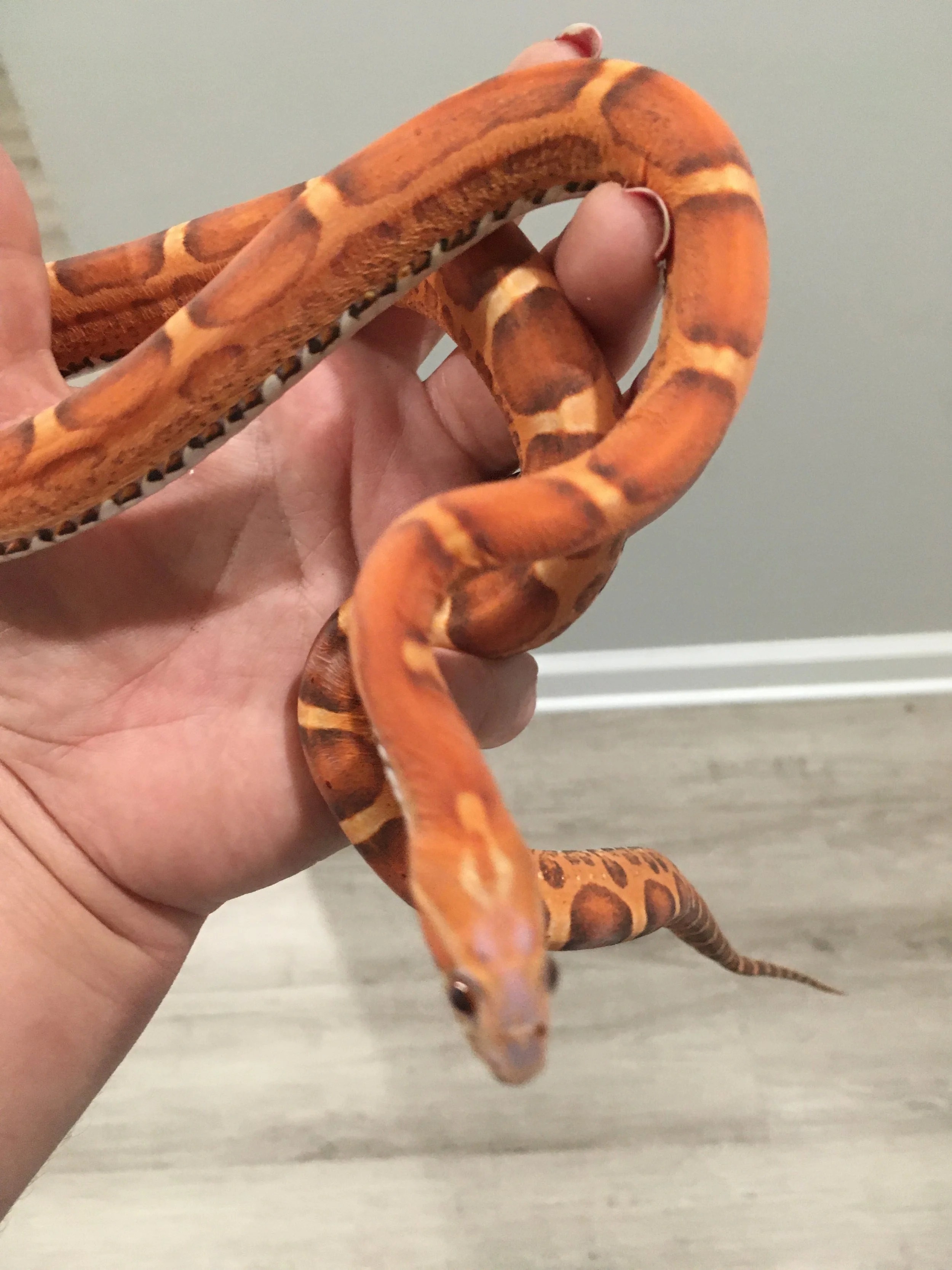 Meet GrumpyFemale, a stunning scaleless female with an amazing genetic potential. She carries the traits of being het for amelanistic and anerytheristic. When paired with the right male, she has the ability to produce a mesmerizing variety of scaleless amelanistics, anerytheristics, and snows, resulting in a beautiful array of colors including shades of orange, gray, and even a white that appears pink in scaleless snakes. Now, here's the fun part about her name - it was the ID given to her by the breeder. However, I must say, by the time she arrived at my house, she had shed any signs of grumpiness and embraced her new home with joy.